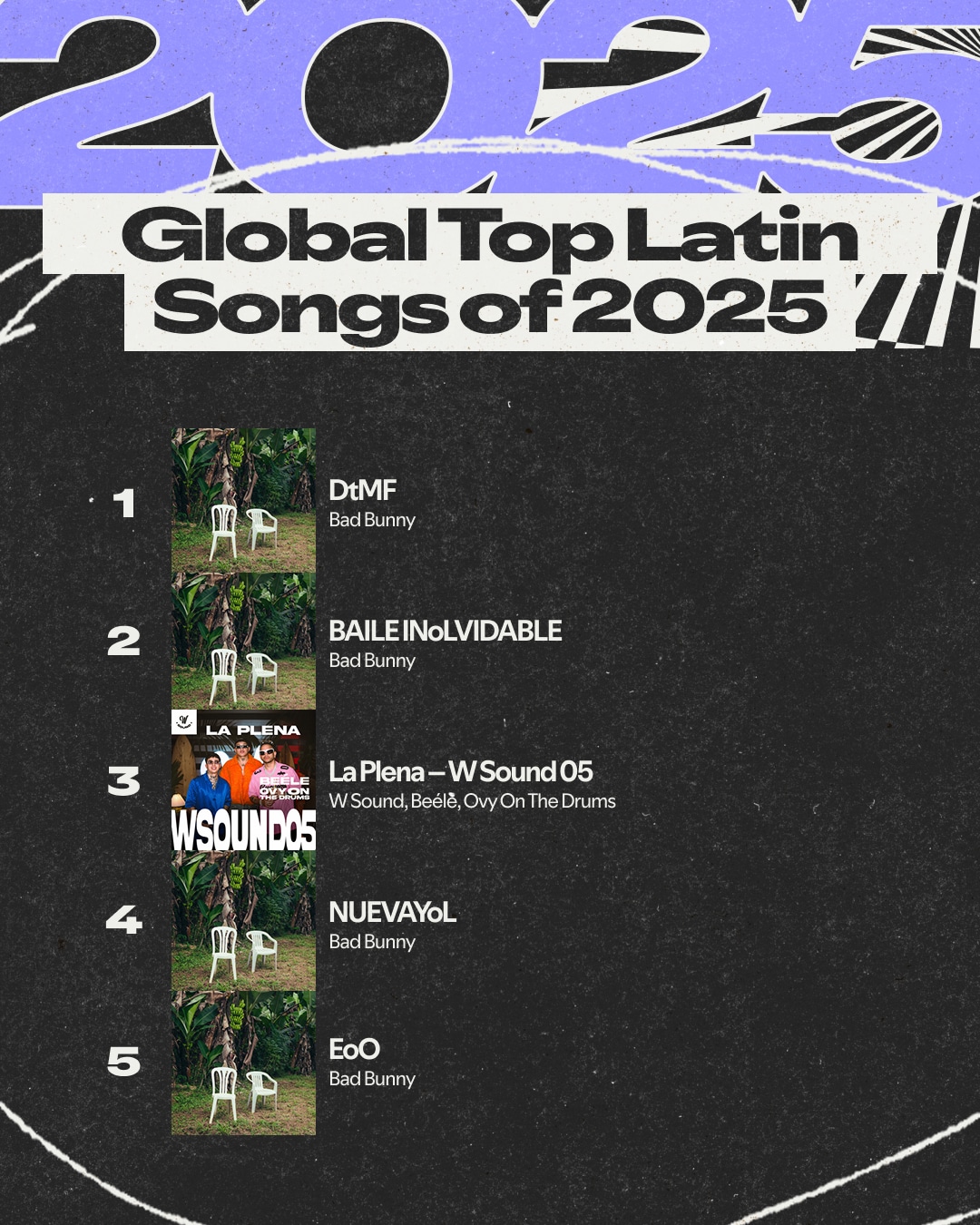 Bad Bunny led global charts with tracks like “DtMF,” “BAILE INoLVIDABLE,” and “NUEVAYoL.” These songs rank among the top Latin songs globally and in the U.S. according to Spotify. He also placed two albums in the Global Top Albums list. DeBÍ TiRAR MáS FOToS sits at number one. Un Verano Sin Ti appears in the top 10.