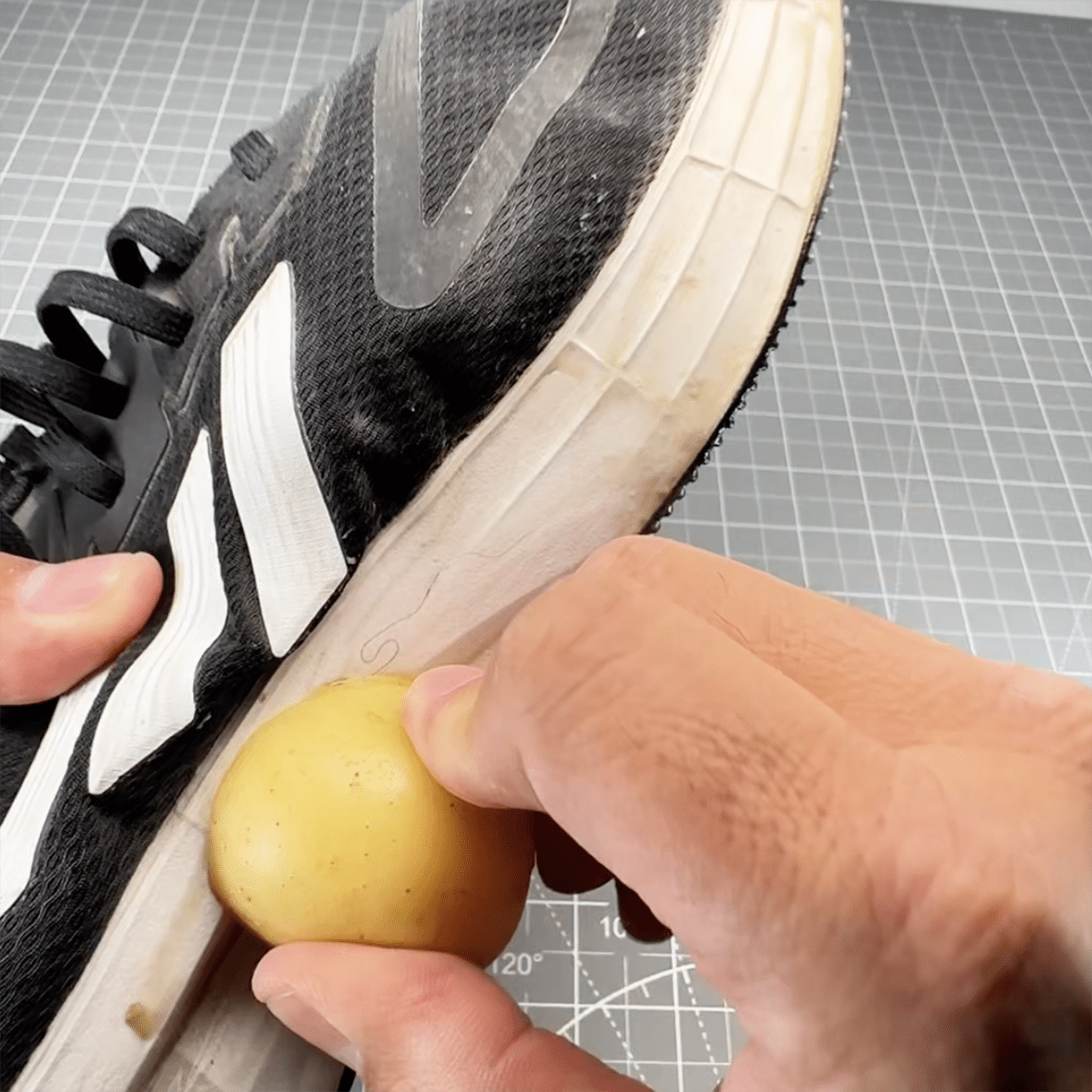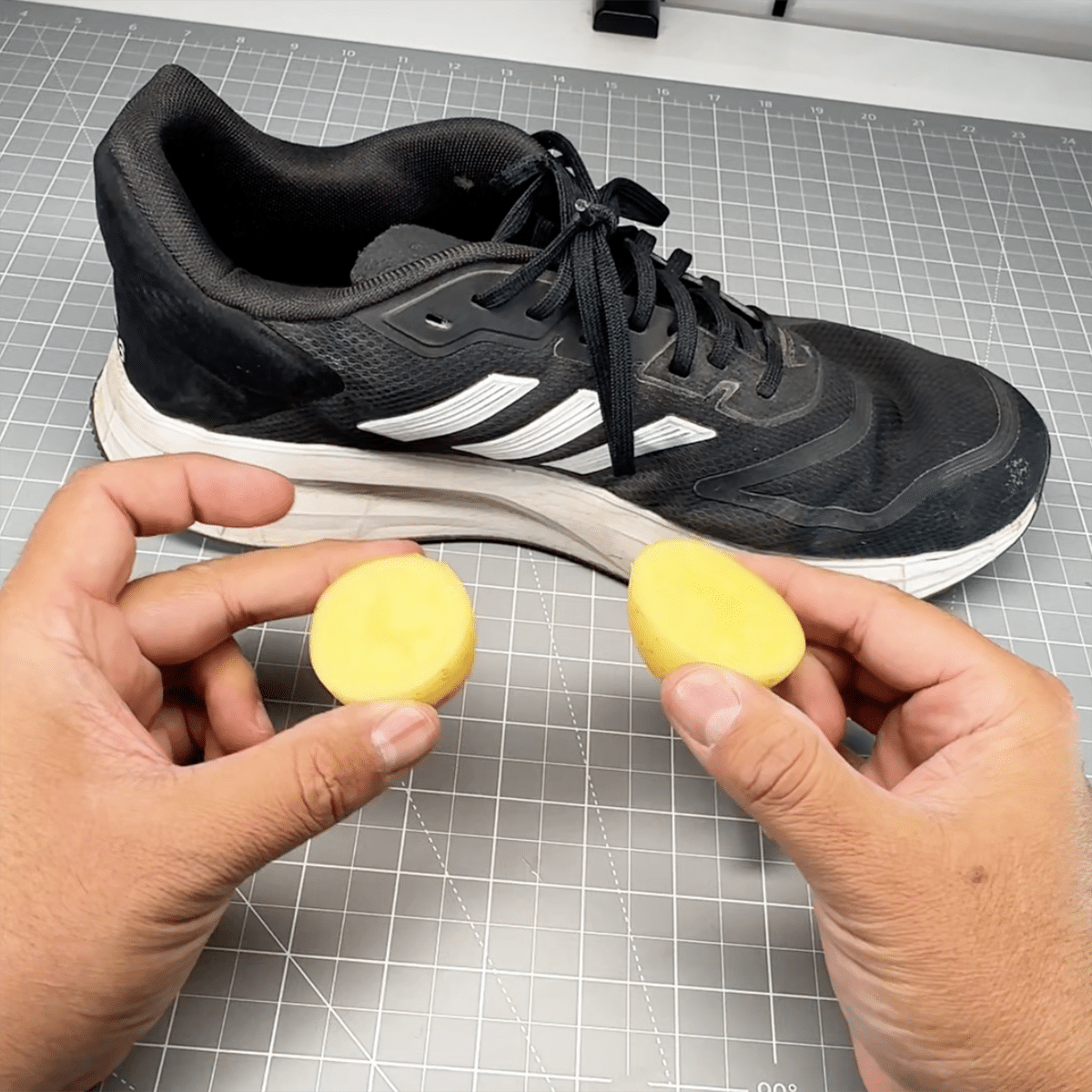 3) Asegúrate de frotar cada espacio de la suela con la papa y deja actuar unos minutos.